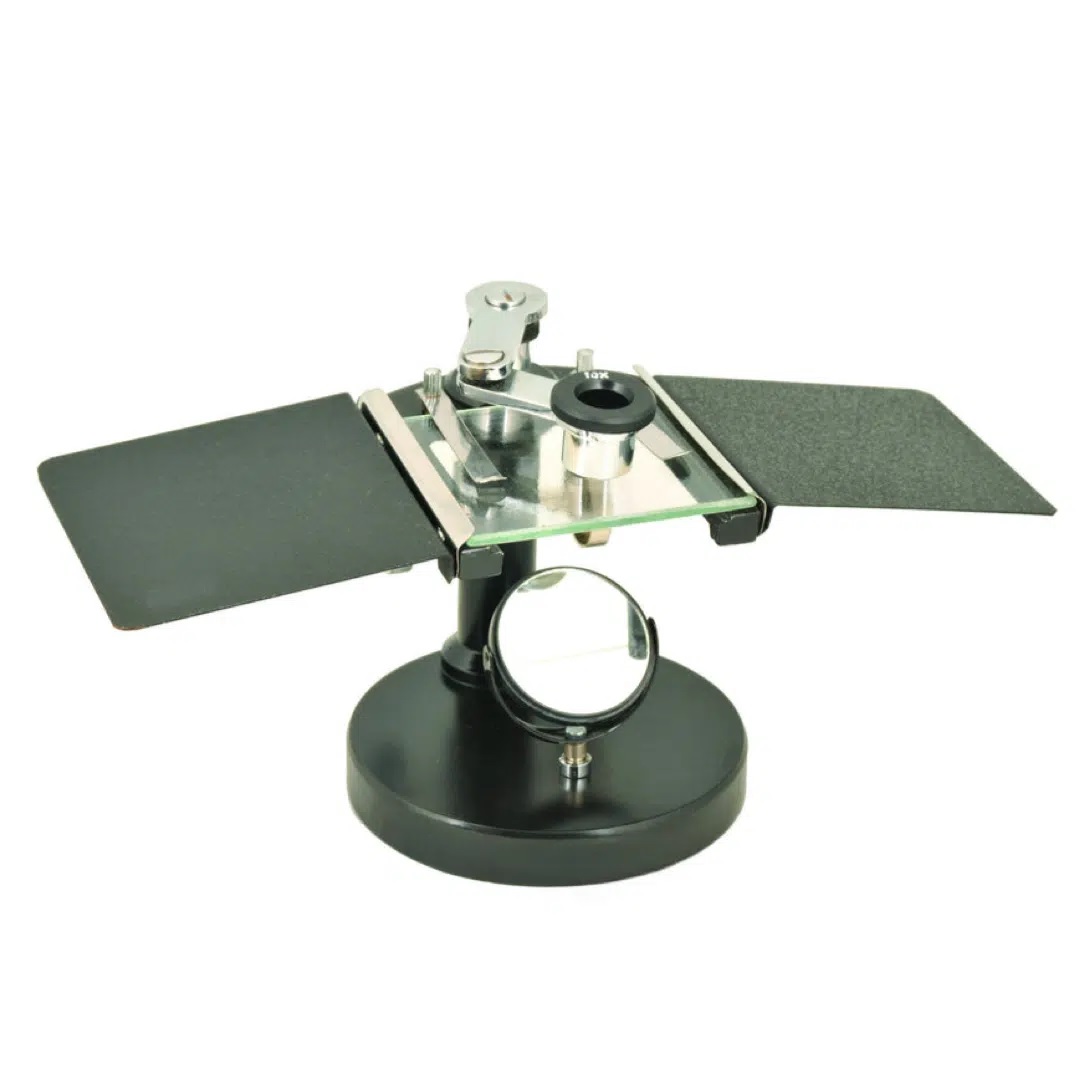 A dissecting microscope, also known as a stereo microscope, is a type of microscope that provides a three-dimensional view of small, opaque objects like insects, plants, and minerals. Both live and dead specimens can be observed using this microscope, and it offers a magnification range of 10x to 20x.