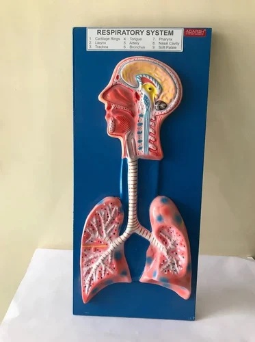This model showing parts of brain, nasal cavity, lungs, bronchial tree, position of heart.Mounted on a base, appropriately coloured and numbered with key card.
