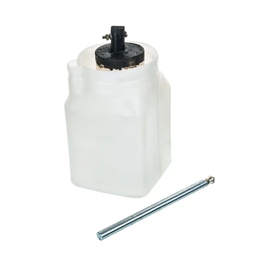 A Leclanche cell consists of a glass container filled with Ammonium chloride solution, which serves as an electrolyte. Within the container, there is a zinc rod and a porous pot containing a carbon rod, surrounded by a combination of manganese dioxide and powdered carbon. The kit includes a filled porous pot, zinc rod, and plastic jar, but does not come with any chemicals.