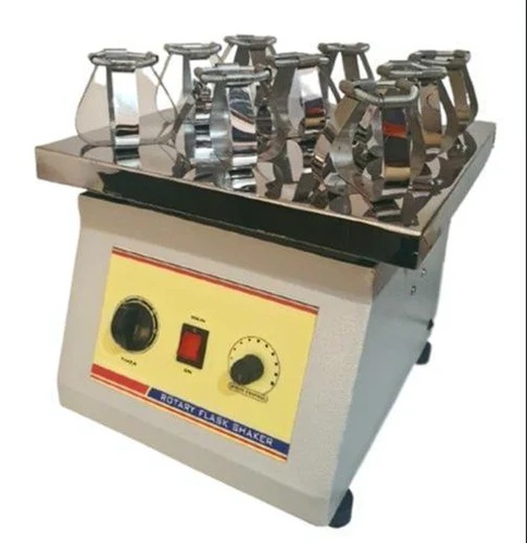 Rotary Shaker 9 Flask 250ml. Driven by D.C. Motor with in a dia. of approx. 2” having Speed range is 50 – 250 RPM. fitted with rubber discs or with stainless steel lotus type clamps to hold flasks. Workable on 220-230 volts A.C 50Hz.